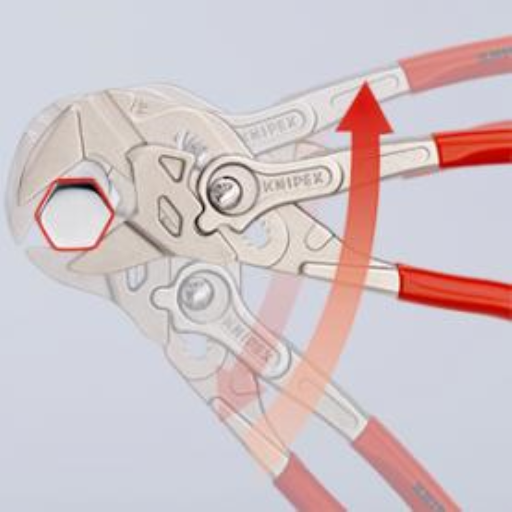 La pince-clé combine de nombreuses fonctions : elle remplace tout un jeu de clés, peut être ajustée très rapidement et directement sur la pièce à travailler par simple pression d’un bouton et elle peut manipuler toutes les largeurs de clés jusqu’à 40 mm grâce à un réglage de la préhension quasiment infini.