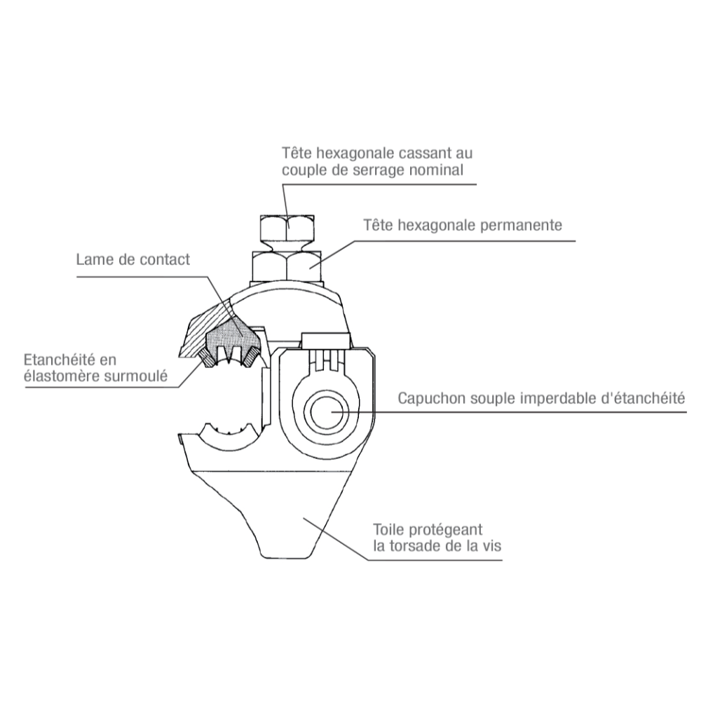 Les connecteurs à perforation d’isolant vous permettent de faire des dérivations de réseaux et de branchements sans avoir à dénuder le câble principal. Une fois la serrage parfaitement accompli, la vis à tête fusible se casse.