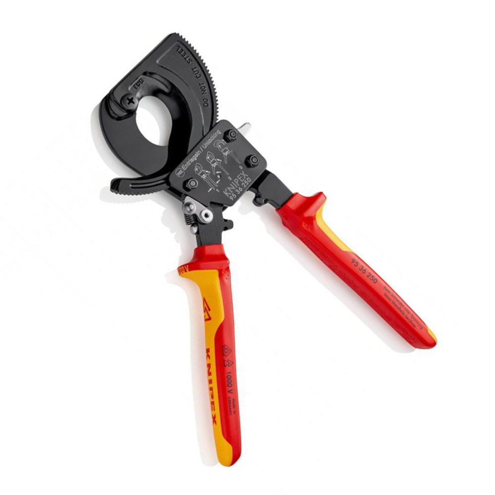 Ce coupe-câbles à cliquet est utilisé pour couper les câbles en cuivre et en aluminium, unifilaires et multifilaires. Il ne convient pas aux fils d’acier, aux câbles métalliques, ni aux conducteurs (très flexibles) à fils fins