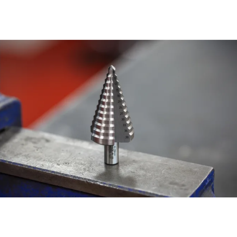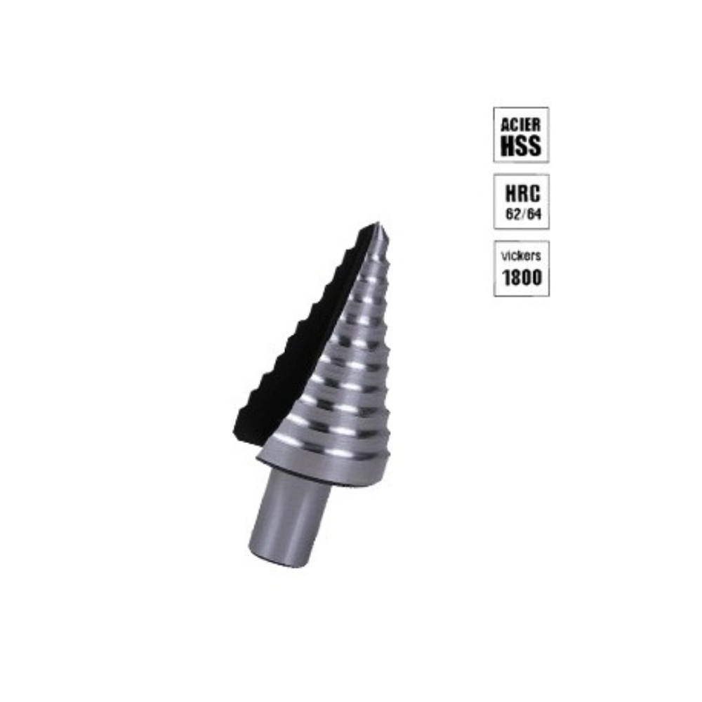 La structure étagée à cotes électriques PE7 à 21, ISO 12 à 32 mm permet de percer, avec un même foret, des trous de diamètres différents dans tous matériaux minces, tôles, bois, plastiques, lamifiés, composites, etc.