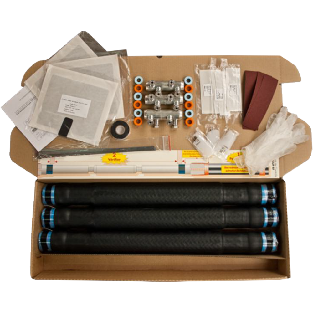 Cet ensemble de 3 jonctions unipolaires préfabriquées rétractables à froid, avec raccord à serrage mécanique, pour câbles unipolaires moyenne tension (type câble NF C 33-226) à isolation synthétique de section 50 à 240mm².