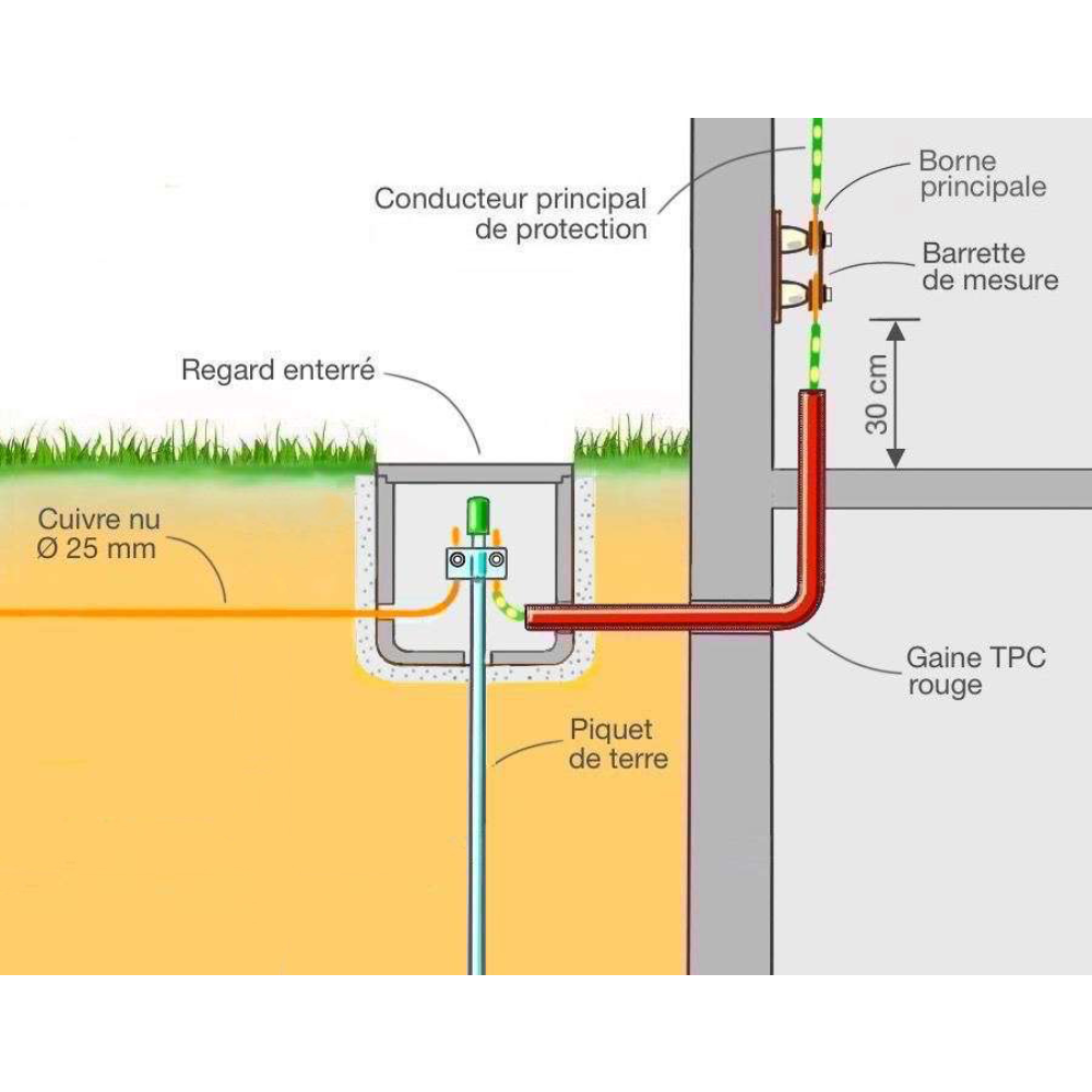 Les piquets de terre permettent l’évacuation des courants de défaut vers la terre en raccordant les carcasses métalliques au circuit de terre. L’installation ne présente alors plus de danger pour l’homme.